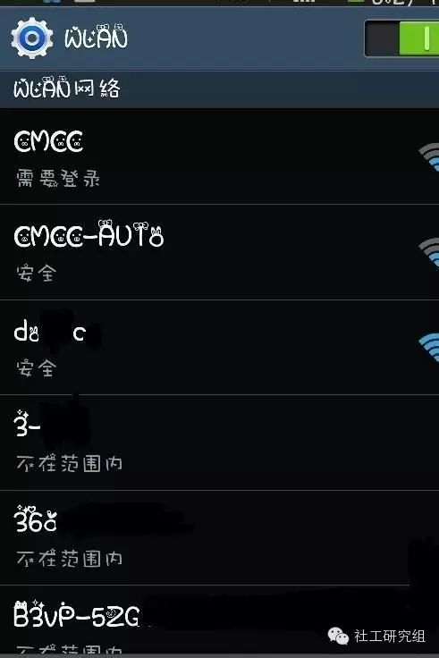 在他的微博中又发现了一张内容为WIFI的截图,图中有一个唯一信号满格的WIFI。我们利用信号满格WIFI的AP名,减少搜索区域规模。用自己手机的WIFI与图片储存相同的AP名来减少范围判断楼号。