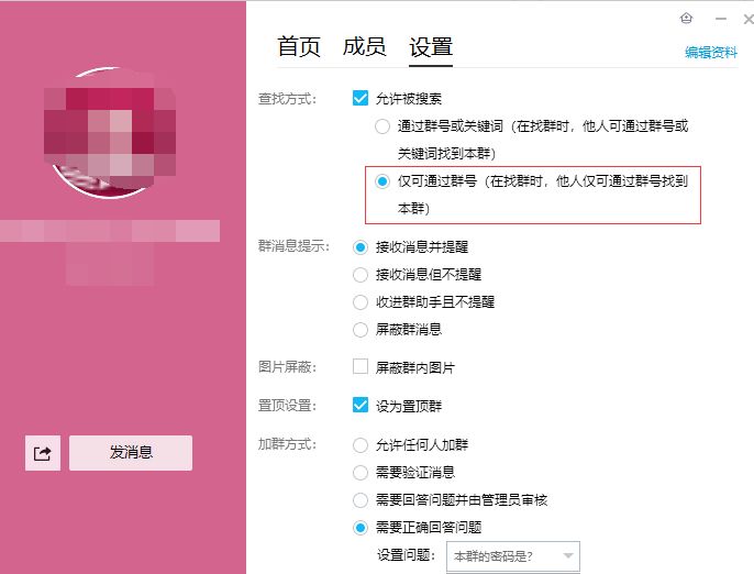 打开群设置,仅通过群号搜索群。